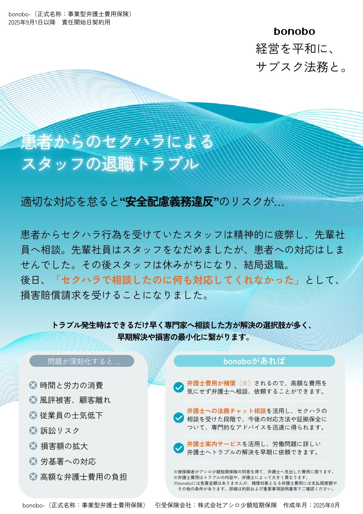 患者からセクハラ行為を受けていたスタッフは精神的に疲弊し、先輩社員へ相談。先輩社員はスタッフをなだめましたが、患者への対応はしませんでした。その後スタッフは休みがちになり、結局退職。